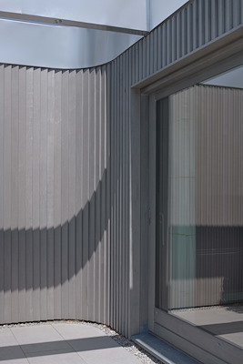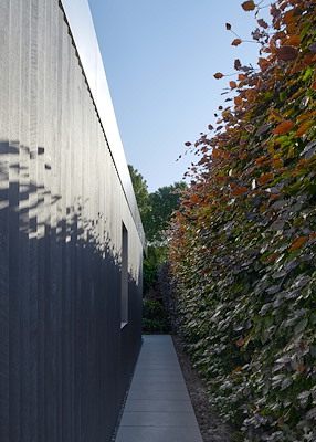 Om de cohesie van het bouwvolume te herstellen werd besloten om zowel de nieuwe als de oude aanbouwen te bekleden met een soortgelijk gevelmateriaal om zo een duidelijke, samenhangende scheiding te creëren tussen het oorspronkelijke huis en de latere toevoegingen.