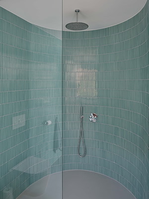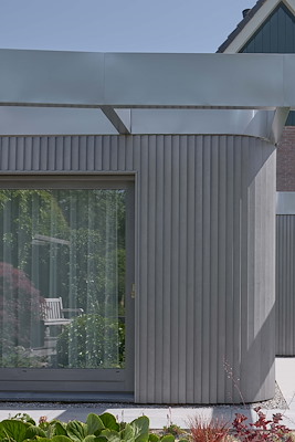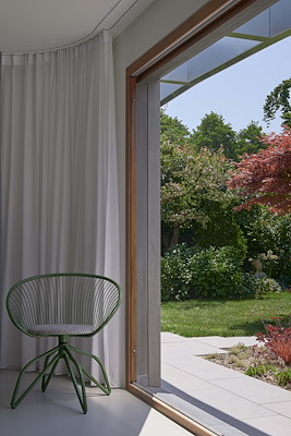 Er zijn twee nieuwe grote schuifdeuren geplaatst om de verbinding met de prachtige tuin te versterken. Een nieuwe pergola verenigd alle uitbouwen en overdekt de buitenruimte. De vorm van de aluminium pergola zet zich voort als dakrand richting de zijkanten en voorzijde van het huis. De pergola omarmt de tuin met een subtiele welving en wordt op zijn plaats gehouden door een in het werk gestorte betonnen kolom.