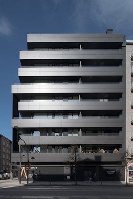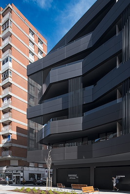 Op een hoekperceel nabij het strand heeft een team van lokale architecten van Ballina Canal een heel bijzonder gebouw opgetrokken met een donkere, metalen gevel die volledig in harmonie lijkt te zijn met deze stemmige, watergrijze omgeving. Gehuld in ALUCOBOND® anodized look, strekken de balustrades op de balkons zich uit als linten rondom het gebouw, inwaarts of uitwaarts wevend om bewegende, zilvergrijze lichtreflecties te creëren in de smalle straatruimte. Ze zijn deels verbonden met privacyafscheidingen die ook zijn bedekt met ALUCOBOND®. De gevel lijkt geweven en, ondanks zijn donkere gewicht, nog steeds organisch en doorlaatbaar. Achter dit donkere gordijn hebben de architecten gekozen om de glazen gevel van het gebouw goed naar achteren te plaatsen. Grote en soms zeer diepe loggia's bevinden zich in de tussenlaag tussen de gevel en de gordijnwand. Ze openen de leefruimte naar de buitenwereld en bieden goede beschutting tegen regen, wind en nieuwsgierige blikken. De loggia's, compleet met hun metalen gordijnen, leveren ontwerp- en ruimtekwaliteiten in een stedelijke omgeving die beide missen. In het interieur van het gebouw blijven de architecten trouw aan donkere oppervlakken maar gebruiken ze lichtpunten en lichte materialen als contrasten.