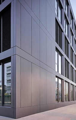 When it comes to major cities in Germany, Düsseldorf tends to fly under the radar. Yet this tolerant and varied city is strong in economic terms, located in a future-oriented region where the population is increasing and, thanks to its airport, able to offer excellent international links. A new office quarter has been built precisely here, at the airport, and the Smart Office by SOP Architekten is set right in the middle. The Smart Office has a lot in common with Düsseldorf itself: at first glance, it looks business-like, elegant, urbane and sizeable in its dark ALUCOBOND® façade in terra Lava Nera, architecturally in keeping with the characteristic post-war modernism in the state capital. The façade on the five-storey building is in a strict grid format with identical windows forming long rows and a huge entrance portal on the side facing the road. The tailor made ALUCOBOND® tray panels are invisibly riveted and their surfaces and joints follow the exact lines of the reinforced concrete building’s supporting structure and layout grid. The modernists used the very same architectural device to link curtain walls with the structure. Bands of ALUCOBOND® framing the windows bring more light into the building and give the façade a more three-dimensional appearance. The first glance is followed by a second one: if you change your vantage point, walk around the building or through the mighty entrance portal under a glass connecting bridge, you arrive in one of the courtyards. This is where the inherent delicacy and diversity of the building’s structure become apparent. The building which presents a powerful and austere exterior, is divided into two h-shaped buildings with wings of different widths. This ensures good lighting in the more recessed parts of the property and a welcoming environment in the sheltered courtyard areas. Added to this, the structure of the building means interior space is flexible and available for very different office layouts, both small and large. In this respect, the building is an ideal match for Düsseldorf: concealed behind the elegant, business-like ALUCOBOND® façade is an unexpectedly diverse and flexible range of spaces for different purposes. Both the exterior and interior make the Smart Office resilient, sustainable and fit for the future.