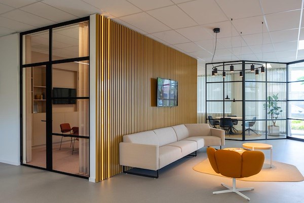 Dit open en luxueuze kantoor vind je bij Lande Family. Zij kozen voor aluminium muurbekleding met LED-verlichting en glazen binnenwanden en -deuren IDA om sommige ruimtes af te sluiten. Aliplast partner