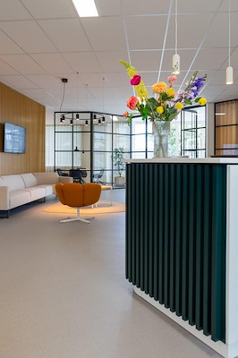 wordt meestal aan de buitengevel geplaatst, maar kan ook perfect binnen. In dit kantoor werd voor de binnenmuren de Deco Wall in goudkleur 1001M gekozen met geïntegreerde LED-verlichting. Voor de balie kozen ze de donkergroene kleur 6012M die soepel de gebogen vorm volgt.