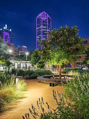Verspreid over het plein bevinden zich natuurlijke elementen, verhoogde plantenbakken en weelderige tuinen met kronkelende paden en speelse hoogteverschillen die uitnodigen tot verblijven. Vierenveertig nieuw geplante bomen en organisch gevormde plantenvakken brengen een hommage aan de Blackland Prairies in Texas. Voor de lagere begroeiing is bewust gekozen voor een gevarieerd palet van duurzame vaste planten en grassen. De nadruk ligt hierbij op inheemse en adaptieve beplanting die weinig water nodig heeft en vlinders en andere insecten aantrekt. Streetlife leverde klassiek parkmeubilair met een moderne uitstraling, zoals gekromde banken die de lijnen van de glooiende plantenvakken volgen en uitzicht over het groen bieden. In het midden van het park, waar de paden elkaar kruisen, wordt een nieuw geplante eik omringd door een
