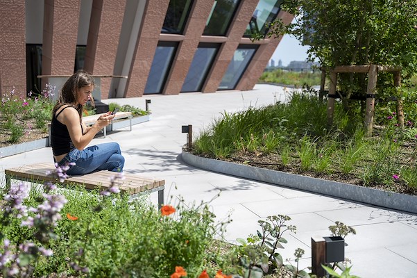 De daktuin is groen en weelderig ontworpen door Jeroen Hamers. Van Ginkel legde het aan. Voor de verharding op de daktuin, zo’n 900 m2, is de expertise van Zoontjens ingeschakeld. In het ontwerp was een rechthoekige tegel in halfsteensverband voorzien. Uiteindelijk is gekozen voor de