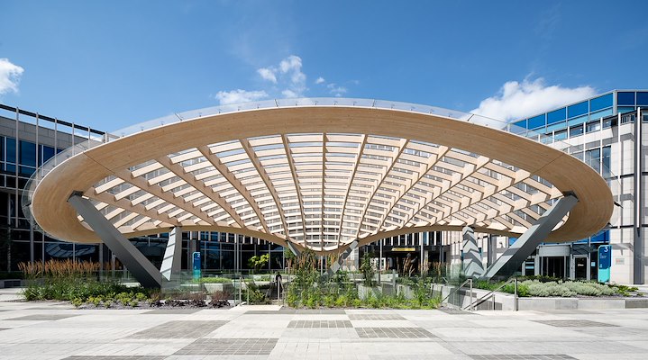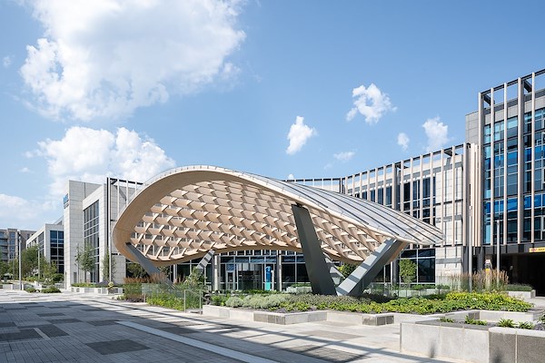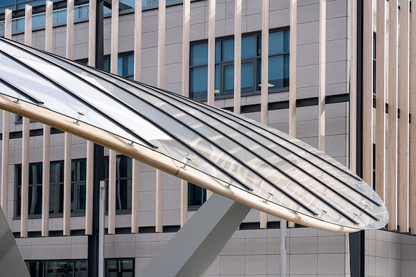 De houttypologie van de Campus Canopy bestaat uit drie balken: de randbalk, de primaire balken en de secundaire balken. De slanke randbalk loopt rondom de overkapping en is enkelvoudig gebogen, behalve op de hoeken: daar is de balk dubbel gebogen. Hij verandert rondom licht van vorm en heeft verschillende hellingen (voor onderhoud). Vanuit constructief oogpunt was deze balk een bijzondere uitdaging, omdat hout niet goed bestand is tegen torsie. Grote stalen verbindingen dragen de krachten over tussen de randbalkelementen. Zelfs van dichtbij zijn deze staalverbindingen niet zichtbaar. We zijn erin geslaagd om deze te verbergen met behulp van een stalen inzetstuk, waardoor de beweeglijkheid van het ontwerp benadrukt wordt. Hetzelfde is bereikt met de primaire balken (de balken die van voor naar achter lopen). Alle primaire balken zijn verschillend en veranderen van vorm en kromming. De verbindingen met de randbalk zijn echter vloeiend.