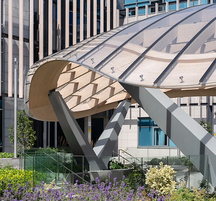 is uitgevoerd in gelamineerd gelijmd hout, glas en staal. Het is een ogenschijnlijk eenvoudig ontwerp: drie V-vormige kolommen dragen een gebogen houten grid dat is bekleed met glas. Octatube heeft d