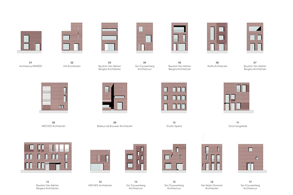 -eeuwse panden. Het bouwblok sluit aan bij deze sfeer en is ontworpen als een schakeling van panden. Elk pand heeft een eigen karakter en weerspiegelt de specifieke wensen van elke deelnemer met betrekking tot de ruimtelijke indeling en verschijningsvorm van het huis. De verschillende panden worden samengebonden door een baksteenarchitectuur met één palet van materiaal en kleur. Dat palet vormde ook de basis voor de uitwerking tot één gemeenschappelijk bouwplan.