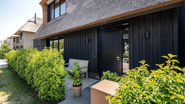 “Wat die eigen stijl inhoudt? Dat zie je vooral terug in het gebruik van veel duurzaam hout. De keuze voor hout komt voort uit de natuurlijke omgeving van bos en water. De woningen hebben houten veranda’s, houten aanlegplaatsen én houten gevels met verticale planken van Cape Cod. De rietgedekte villa’s hebben grote gevels met drie tinten Sandalwood die prachtig bij de aanlegsteigers passen. De houten, robuuste gevels van de havenhuizen refereren aan de oude kruitfabriek. En typerend aan de boothuizen is het contrast tussen de zwarte houten geveldelen en de witte kozijnen. En bij de huizen met taupe gevels contrasteren de zwarte gevels weer mooi. Heel gedurfd, maar het past ontzettend goed bij elkaar.”