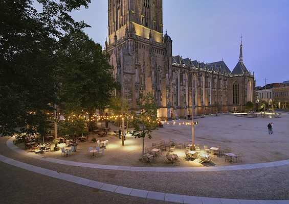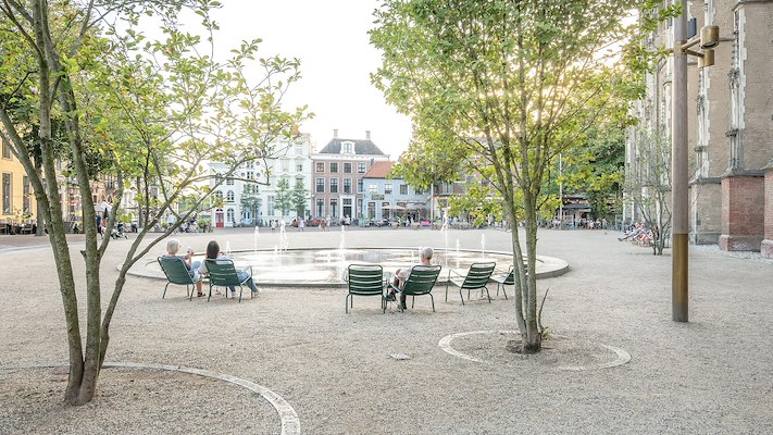 Bomen, groen en verkoeling - De toegenomen hoeveelheid groen in de binnenstad geeft meer schaduw en daarnaast beter verspreide schaduw. Dat zorgt voor minder hittestress. Naast de 28 bomen die blijven staan, komen er in totaal 21 nieuwe bij. We kozen voor verschillende soorten, ook om te voorkomen dat als er een bomenziekte uitbreekt onder één soort ineens álle bomen het loodje leggen. Op het Grote Kerkhof verkeerden helaas niet alle bomen in goede conditie. Zowel vanuit technische als ruimtelijke overwegingen is hier besloten 7 bomen te vervangen door 16 nieuwe exemplaren. Bestaande bomen krijgen een ‘bomen-APK’ door grondverbetering. Tegenover de Botermarkt maakt een deel van de huidige bestrating plaats voor bloemen, planten en hagen. Wie ’s zomers verkoeling zoekt, kan neerstrijken op het terras onder de schaduwrijke bomen. De grote waterspiegel waarin kinderen kunnen spetteren, zorgt voor veel verdamping en ook dat werkt verkoelend.