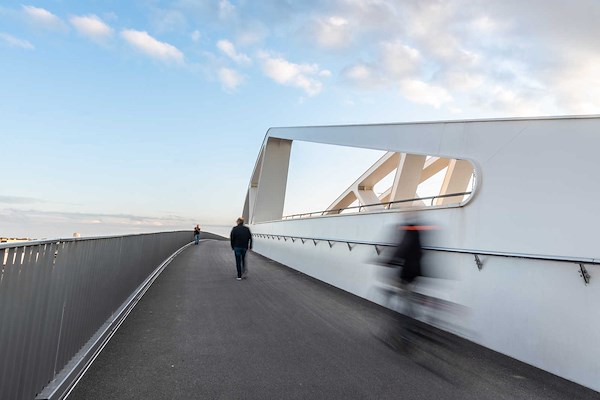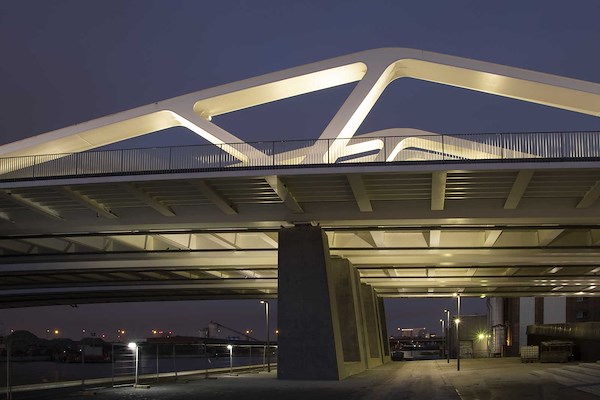 Als je als een roofvogel boven Antwerpen kon hangen dan zou je de glinsterende Schelde zien die sloom slingerend vanuit het achterland langs de oude stad stroomt en uitmondt in een wereldhaven aan de Noordzee. Terwijl uit alle richtingen wegen samenkomen in een kluwen die De Ring heet en al decennia een groot verkeersprobleem vormt voor lokaal en doorgaand verkeer. De stad staat aan de vooravond van een groots project dat het leven met de Ring aanzienlijk hoopt te verbeteren, deels door overkapping en door de aanleg van geluidsschermen en groen. En dwars door die stad, van Schelde naar het Oosten doorklieft het Albertkanaal de noordkant van de stad om de Limburgse steden en Luik met de Antwerpse haven te verbinden. De hedendaagse binnenvaart vraagt om grotere sluizen en bredere vaargeulen en ook bij Merksem in het noordoosten van de stad wordt een bocht in het kanaal twee keer zo breed en de doorvaarthoogte vergroot. Dat vereist een geheel nieuwe Theunisbrug. In opdracht van De Vlaamse Waterweg ontwierp architectenbureau ZJA, in samenwerking met Arcadis, Sweco en OKRA Landschapsarchitecten, de verbinding van Duivelsplein naar Schijnpoortweg, over het Albertkanaal.