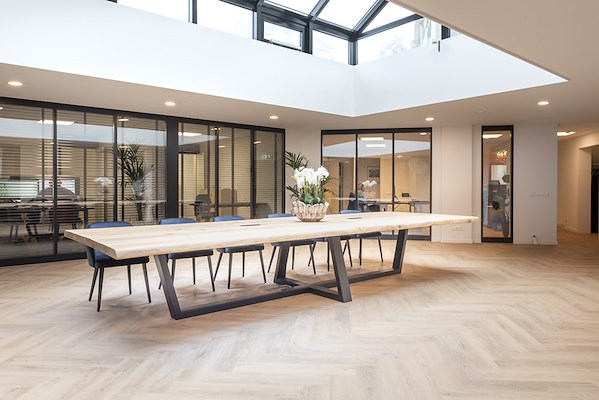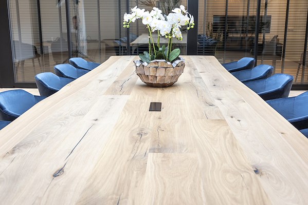 ZwaarTafelen maakt massief houten tafels op maat en voor hen is niets te gek. Deze rustiek eiken boomstamtafel heeft een extreem groot blad van maar liefst 450 cm. Eikenhout wordt gekenmerkt door prachtige scheuren en knoesten in het hout! Bij dit blad hebben is de natuurlijke vorm van het eiken intact gehouden, waardoor een prachtige boomstamrand ontstaat. Dat zorgt voor ?de natuurlijke uitstraling van het blad.’’ ?