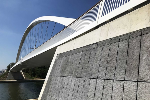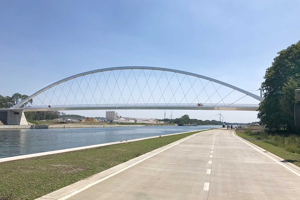 De sprong over het kanaal is ruim en lang, maar liefst 140 meter en de boog reikt tot 20 meter hoogte. Het slanke wegdek is van staal met een dunne laag beton. Met zijn 9 meter breedte is het een majestueuze fietsbrug. Wie wat langer kijkt zal zich afvragen hoe met die relatief dunne hangers en de slanke boog de brug overeind gehouden wordt. Dit is mogelijk dankzij het slimme netwerk van hangers die allemaal onder een andere hoek aan de constructie zijn bevestigd. Dat maakt de brug sterk en elegant en bovendien levert die onregelmatigheid een levendig visueel effect op tijdens de passage.