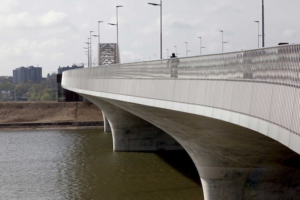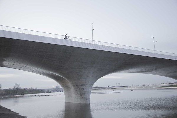 Vanuit de verte biedt de Verlengde Waalbrug al een intrigerende aanblik, maar wandelend langs de oevers van de Spiegelwaal zijn de vloeiende lijnen en de weerspiegeling van het licht in het water tegen die natuurlijk wijkende volumes ronduit verbazend mooi. Alsof de stromende rivier zelf de pijlers heeft geboetseerd. En let op een detail in het beton, daar waar pijler en dek elkaar ontmoeten in wat je de oksel van iedere pijler kunt noemen. Alsof de pijler een arm is die kracht zet en daardoor een kuiltje toont. Ook beton kan subtiele vormen aannemen.