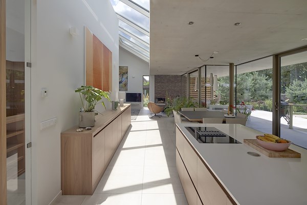 Rondom deze zes dennen worden de belangrijkste woonfuncties gelegd. De woonkamer, eetkamer en keuken richten zich op de tuin en de avondzon en worden opgetild ten opzichte van de tuin. Een ruim terras op hetzelfde hoge niveau verbindt, met een paar treden, het wonen met de tuin.