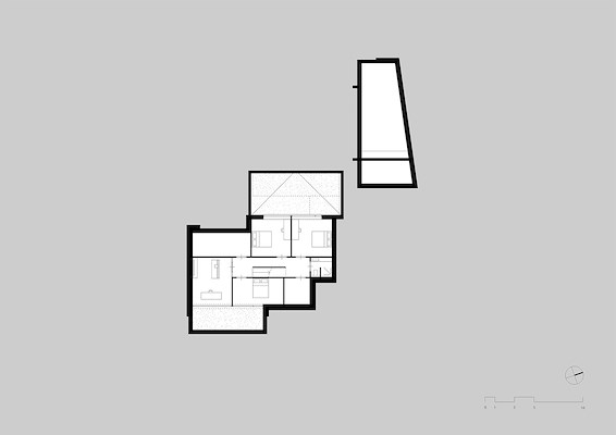 Aan de voorzijde van de woning wordt op maaiveldniveau de hoofdslaapkamer gesitueerd. Een kleine patio voor de slaapkamer zorgt voor meer privacy en filtert het ochtendlicht. Grenzend aan de slaapkamer ligt een vleugel met een wellness: een badkamer met sauna en het zwembad. De vleugel steekt de tuin in, waardoor je vanuit het zwembad zicht hebt op de prachtige dennen. Een daklicht boven de douche haalt ook hier het buiten naar binnen.