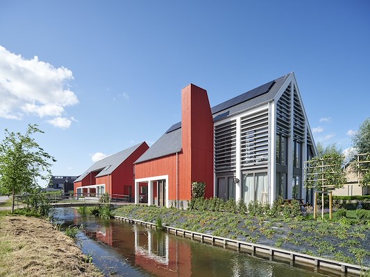 Een terughoudend volume, dat zich vlijt aan de rand van de wetering, bevat twee woningen. In het midden van het volume vouwt de schil zich naar binnen en ontstaat een buitenterras aan het water. De woonruimtes groeperen zich rondom deze buitenruimte. Zo ervoor zorgend dat de avondzon tot diep in de woning valt. Het hoofdhuis is gelegen op de kop van de landtong, tussen de twee vaarten en is van alle zijdes zichtbaar. Sprongen in het drielaagse volume zorgen voor beschutte plekken op de ochtend- en avondzon. Een schoorsteen wordt extra uitvergroot en expressief vormgegeven en vormt het ankerpunt van het plan. De houten schil van de woningen is uitgevoerd in fijnbezaagde planken in een diep rode kleur, waarin de contrasterende snedes in het volume afgewerkt worden met een gladde witte band. Door de zorgvuldige materialisering en detaillering, de expressieve vorm van het hoofdhuis en de verankering op de plek, vormt het ensemble een echte eyecatcher op deze centrale plek in de wijk.