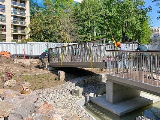 Streetlife ontwerpt haar bruggen in huis en levert deze prefab op de locatie aan. Hierdoor kon de aannemer Val d’Oise Paysage de brug en het platform in één dag plaatsen. Door deze gekromde brug uit twee secties op te bouwen kon het efficiënter naar Levallois-Perret getransporteerd worden.