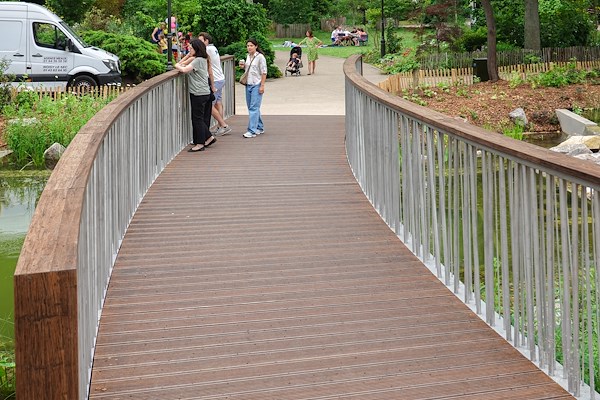van Streetlife volgt de meanderende lijn van het pad, waardoor de wandelaar op natuurlijke wijze over het water wordt geleid. Aan weerszijden van de brug hoor je het water vallen. De hoge handreling nodigt uit om even te leunen en uit te kijken over het water. Afhankelijk van het seizoen, kan men hier vissen, watervogels of schaatsenrijders observeren. Aan de overkant van het water is het uitkijkplatform uitgevoerd in dezelfde stijl als de brug, waardoor een eenheid wordt gecreëerd. De rvs-spijlen zijn kriskras geplaatst en doen denken aan de grassen langs de kant.