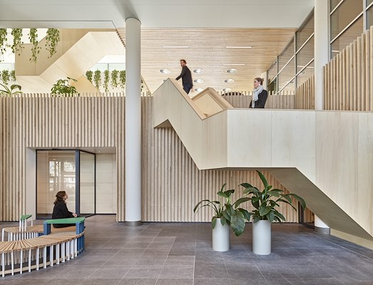 "We moesten zorgen voor goede akoestiek in de ontvangsthal. Een belangrijk element bij de inpassing van de functies in deze ruimte, die gekenmerkt wordt door veel glas en een harde vloer. De toegepaste Troldtekt Cradle 2 Cradle houtwol panelen dragen bij aan een verbeterde akoestiek. Zo hebben we de ontvangst- en ontmoetingsfunctie goed kunnen inpasÂsen in de bestaande situatie, die hiervoor niet zonder meer geschikt was", voegt Ingrid Bekx, interieurarchitect bij De Twee Snoeken, toe.