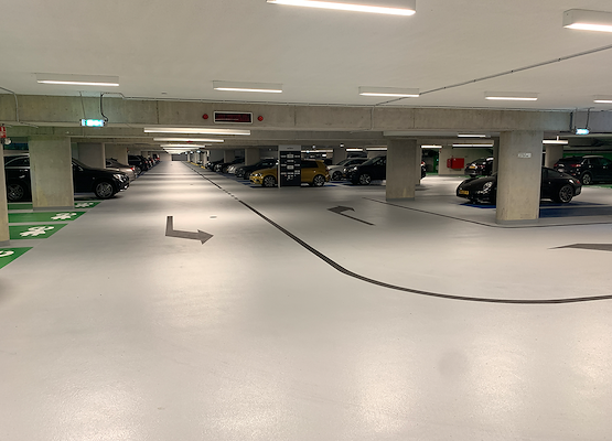 de oplossing. Dit systeem is een slijtvast vloersysteem dat onder andere wordt toegepast in intensief gebruikte parkeerkelders. Het systeem is waterdicht en vuil krijgt geen kans om in de vloer te trekken. Dit maakt het systeem ook goed te onderhouden. Door de afwerking vol en zat in te strooien ontstaat er een zeer slijtvaste vloer die tevens zorgt voor voldoende antislip. De finish zorgt niet alleen voor dat de vloer beschermd is tegen het indringen van vuil, maar door de vele kleurmogelijkheden kan er een gewenste sfeer gecreëerd worden, waar de bezoeker zich prettig voelt en goed de weg weet te vinden.