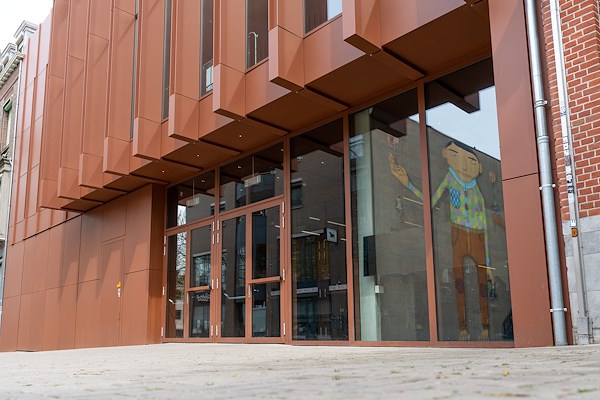 Wie van binnen de trap volgt naar de zaal op de eerste verdieping kan niet om de grote raampartij in de voorgevel heen. Het venster kijkt precies uit over het Schelmenhofje. Een kleine binnenplaats tegenover de nieuwbouw die bekendheid kreeg toen de Braziliaanse kunstenaars Otávio en Gustavo Pandolfo er een grote muurtekening maakten. Meurders koos bewust voor een royale raampartij op deze plek. “Ik wilde geen lege vitrine bouwen. Het moet niet alleen aantrekkelijk zijn als er een optreden is. Overdag moet het meegaan in het historische straatbeeld zonder al teveel aanwezig te zijn. De gevel richt zich op dit hofje en heeft qua breedte ook dezelfde afmetingen. Zo ontstaat er een eenheid. Van binnen heb je zicht op moderne graffitikunst met op de achtergrond de middeleeuwse toren van het Landsfort Herle.