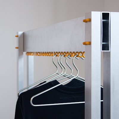 Base is een unieke combinatie van hoogwaardige materialen: aluminium, beton en kleurrijke gepoedercoate bouten om hangers met kleding in te hangen. De twee betonnen blokken zorgen ervoor dat het rek goed blijft staan en geeft een extra platform om accessoires of schoenen te presenteren. Dit exclusieve kledingrek toont kledingstukken niet alleen op stijlvolle wijze, maar maakt ook een opvallend statement en laat een blijvende indruk achter op winkelbezoekers.