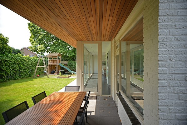 Door een overmaat te nemen is de verbindingsgang tussen de keuken en de tuinkamer ook een aangename ruimte geworden. Dit wordt nog eens versterkt door de ruime overstek die zorgt voor de extra zonwering.