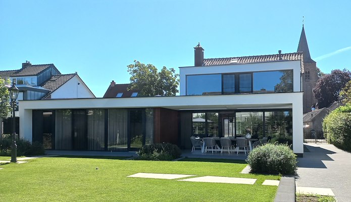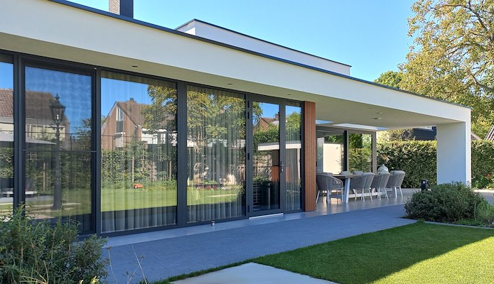 Bij de uitbreiding van dit woonhuis in Waalre zijn de nieuwe ruimten en de veranda aan de achterzijde en de dubbele carport aan de voorzijde en de twee slaapkamers op de verdieping in een strak stucwerk kader geplaatst.