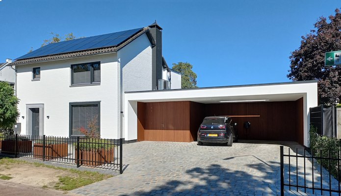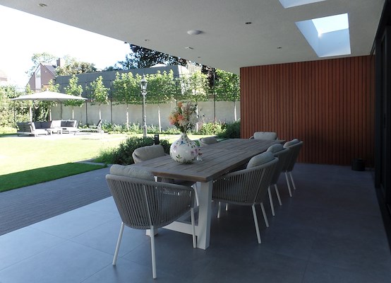 Als contrast met het witte strakke stucwerk kader zijn de wanden met een warme open houten gevelbekleding ter plaatse van de varanda en de carport bedacht. Zowel de veranda als de carport hebben extra daklichten gekregen.