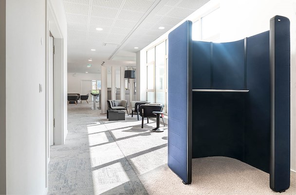 -modellen. Er is gebruik gemaakt van elementen als banken, fauteuils, schermen, bijzettafels en schommelbanken om onderscheidende zones te creëren. De werkplekken worden allemaal aangevuld met een bureaustoel