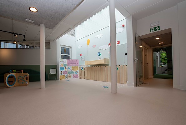 is van oorsprong een kloosterschool. Voor de renovatie bood het gebouw al onderdak aan diverse activiteiten. Er was een bibliotheek in gevestigd, de dienst Erfgoed en een spelotheek voor kinderen. Voor de herinrichting werd gezocht naar meer verbinding tussen de verschillende afdelingen. Dit kreeg gestalte in het gebruik van herkenbare frisse kleuren op de wanden, in het meubilair en in de interne bewegwijzering. De gekozen LiquidDesign-kleur Pearl past hier perfect bij. Naast 280 m² LiquidDesign installeerde MK Floor ook 250 m² Flotex vloerbedekking van Forbo Flooring en in de sanitaire ruimten kwam Sphera vinyl op de vloer. De gemoderniseerde bibliotheek en de andere bestaande gebruikers van het gebouw keerden terug in een frisse omgeving, waar nu ook ruimte is voor een consultatiebureau van Kind en Gezin.