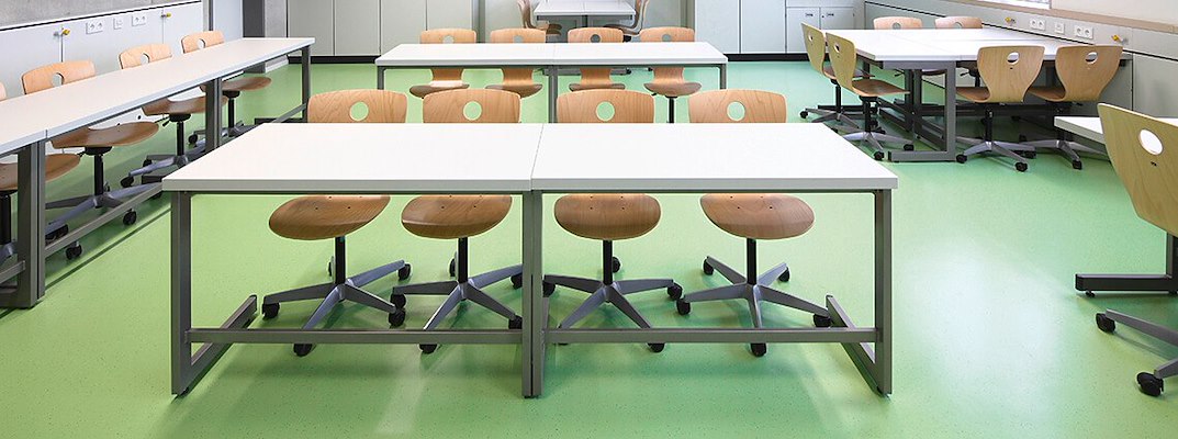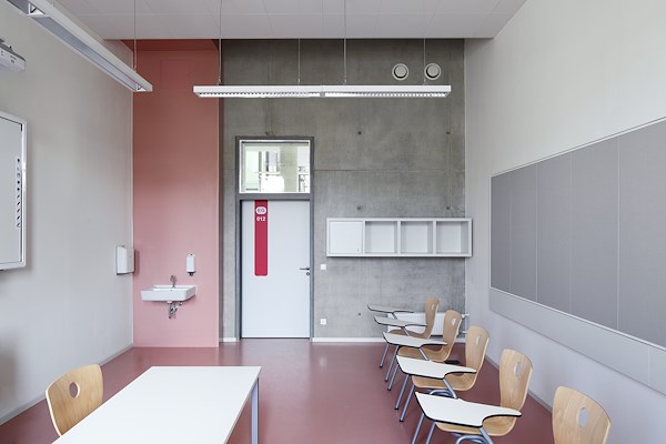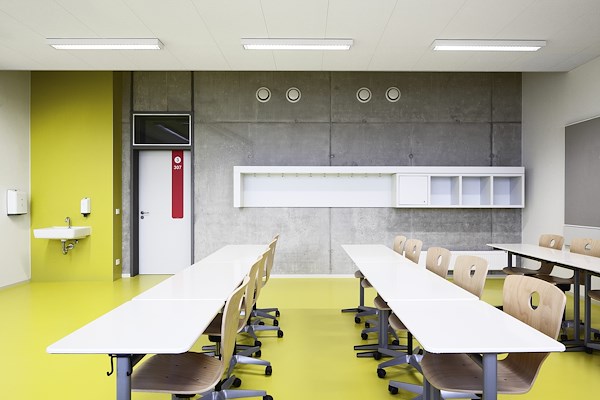 Deze ruwe betonnen oppervlakken worden gecontrasteerd door grote ramen, terugkerende ronde vormen en opvallende kleuren. De keuze viel op meer dan 6.000 m²van de robuuste en designgerichte rubberen vloerbedekking ARTIGO, die in Duitsland exclusief door objectflor wordt verkocht. Het moderne kleurenpalet bood de ontwerpers de mogelijkheid om zeer speciale accenten te leggen: "Het is een vrije keuze uit vier kleuren, niet geselecteerd op basis van functies of kleurcoderingssystemen," vertelt architect Gerhard Dallendörfer van het verantwoordelijke planningsbureau Loewer + Partner Architekten, die het concept uitlegt: "We wilden bijvoorbeeld niet dat de natuurkundedocenten altijd alleen maar in gele ruimtes zouden zitten." De kleuren veranderen schijnbaar willekeurig, waardoor elke ruimte zijn eigen sfeer krijgt. Speciaal voor dit designconcept werden twee vloerbedekkingen in speciale kleuren geproduceerd, omdat dergelijke speciale producties al vanaf een volume van 500 vierkante meter bij objectflor kunnen worden gerealiseerd. In het verlengde van het concept hebben de architecten het kleurenschema ook in andere ruimtes effectief doorgevoerd. Op deze manier komen de gekozen kleurtinten decoratief in het hele gebouw terug en helpen ze het schoolgebouw een identiteit te geven.