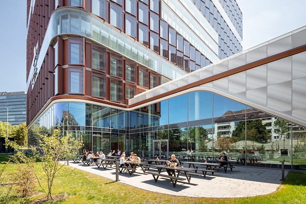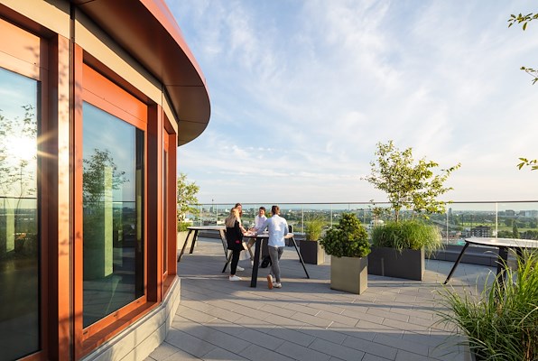 Due to the location of Eclipse, surrounded by two intersecting main roads which generate substantial outside noise, the communal areas for users of Eclipse are to be found essentially in the interior of the office building. The centrepieces are made up of the atria and open spaces situated on several floors and in some cases extending over three storeys. Employees can find a wide variety of communal areas in these atria, among them a cafeteria and an event room. Viewed from the outside, these communal areas can be clearly identified in the façade – wherever flat window panes can be seen in the glass façade, the atria combine like a helix, forming a “vertical campus” that stretches as far as the roof terrace with communal areas and a sweeping view over the city.