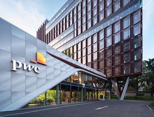 The new office high-rise in Düsseldorf, Eclipse, was completed by end of 2022 and occupied by tenants, the auditing and consulting firm PwC Germany. Situated directly at Kennedydamm in the district of Golzheim and in the immediate vicinity of L`Oréal Germany’s headquarters, the Eclipse adds a new landmark to Düsseldorf’s cityscape. The 16-storey office high-rise, Eclipse, jointly designed by HPP Architects and UNStudio on behalf of die developer with its striking glass façade, soars into the sky directly at Kennedydamm. Directly adjoining the Hilton Hotel, Eclipse is connected to the 70s hotel via a two-storey plinth, and rises over 60 metres in the shape of a triangular prism. The main entrance for visitors is to be found under the prism’s acutest angle with an eleven metre overhang supported by a V-shaped column of reinforced concrete. The entrance reveals an open, generously proportioned reception area with an atrium stretching over several floors. Details made of wood, wall panels of white porcelain stoneware and fine-meshed, bronze-coated expanded metal cladding on the glass lifts offer evidence of the skilful interplay of materials, with a broad staircase leading up to the gallery on the first floor and the steps serving as seats to transform the space into an auditorium.