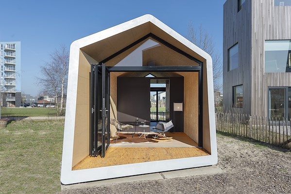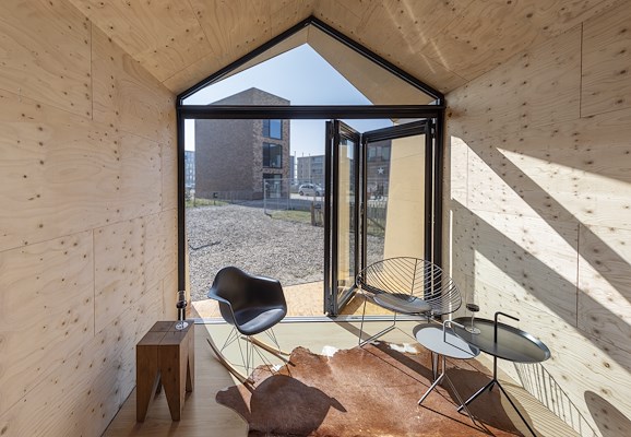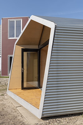 Niet een, maar twee voorkanten. Zodat de gebruiker zelf kan kiezen waar hij of zij gaat zitten. Tiny House Snuk is geboren uit het idee van een strandhuisje, maar komt ook in Almere goed tot zijn recht. Je kunt Snuk overal neerzetten, zelfs op een plat dak.