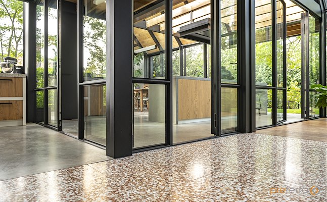 Uniek aan de aanbouw is dat de grenzen tussen binnen en buiten vervagen, nee zelfs verdwijnen. Niet alleen dankzij de glazen wanden, maar ook door de verbinding in materialen. Zo lopen de balken van het plafond door, net als de terrazzo-tegelvloer van buiten naar binnen en de betonvloer van binnen naar buiten. En schuif je de glazen wanden open, dan wordt de woonkeuken een luxe buitenkeuken, en het eetgedeelte een royaal terras.