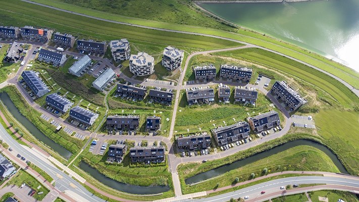 De rivierdijk is verbreed, enerzijds omwille van de veiligheid en anderzijds om hier dijkwoningen tegen aan te kunnen bouwen. Deze dijkwoningen zijn ontworpen rondom een dwars geplaatste centrale trap. De woonruimtes zijn zo veel mogelijk op het fraaie dijklandschap worden georiënteerd. De baksteenarchitectuur heeft een hedendaags en speels karakter.