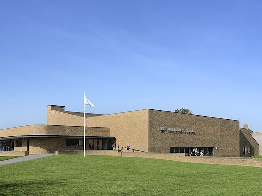 Het Hogeland College in Warffum is een school met een sterke verbintenis met het landschap. De landschappelijke positie van het gebouw doet denken aan de klassieke Groningse herenboerderijen met hun grote gazons. Via een hellend pad loop je naar de entree. De lichte verhoging geeft de bescheiden entree een voornaam en uitnodigend karakter. Het geeft toegang tot een ‘bel-etage’ zoals dat bij veel herenboerderijen op het Hogeland te vinden is. De verhoogde ligging geeft bijzonder zicht op het omliggende terrein. Dat geldt in het bijzonder voor de aula die direct naast de entreehal ligt. Van hieruit is ruim uitzicht op het sportterrein dat omkaderd is door de bestaande windsingel van het dorp.