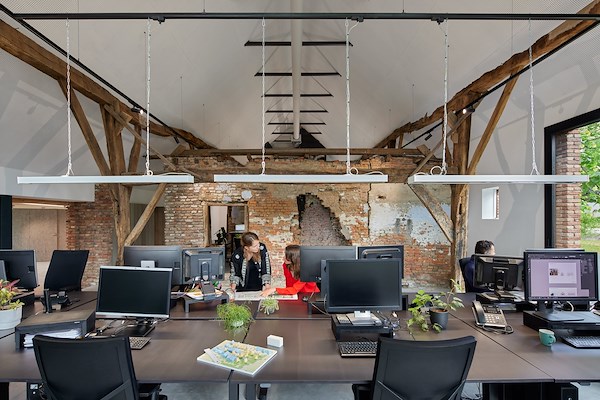 De bestaande boerderij is zorgvuldig getransformeerd naar een gezonde werkomgeving. In de historische boerderij zijn de oorspronkelijke spanten (uit 1583!) gefixeerd, een nieuwe staalconstructie draagt het dak. De nieuwe thermische schil is bewust op een aantal plekken doorbroken met een glazen pui om zo de prachtige, oorspronkelijke buitenwanden te tonen. Bestaande binnenwanden zijn zoveel mogelijk in hun waarde gelaten. Deze gerafelde wanden tonen de sporen van de voormalige bewoners, met restanten van pleisterwerk in kleur en spijkers waar destijds misschien wel een familieschilderij hing. De tand des tijds mag gezien worden. Verhalen ten overvloede!