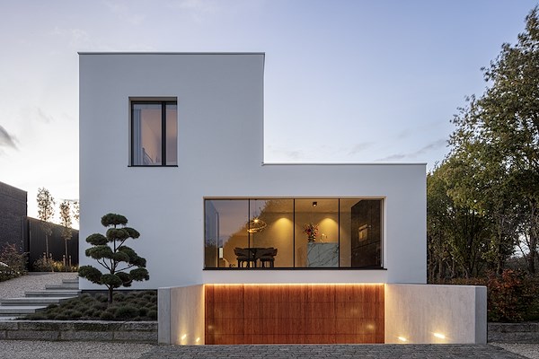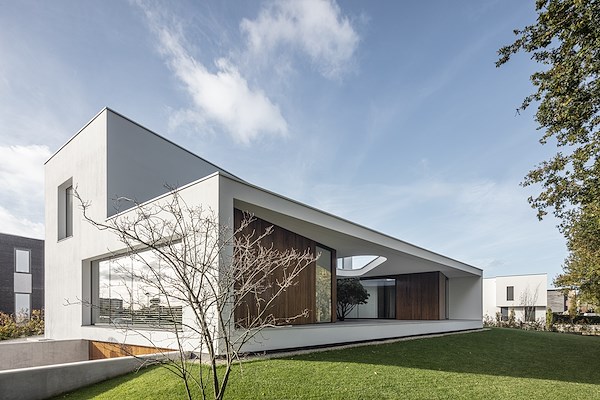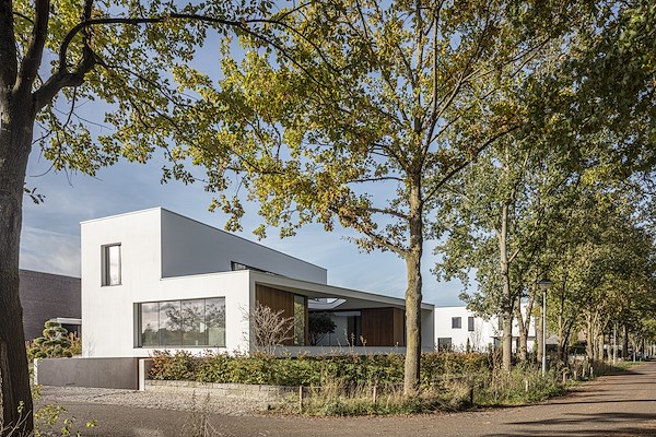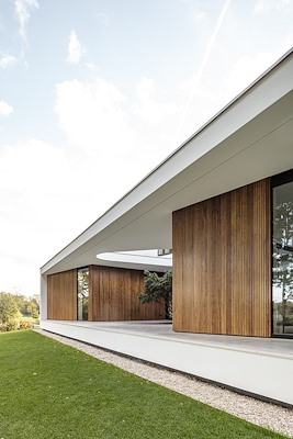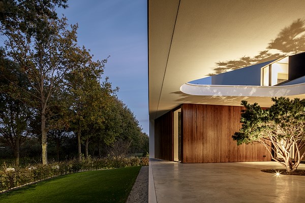 De villa is met sober witte stucwerk uitgevoerd, afgewisseld met houtwerk, glas, aluminium en beton. Het gebruik van prachtig houtwerk in de garagepoort en in de patiowanden zorgt voor een warme touch. De positie van het beton zorgt ervoor dat het lijkt alsof de villa boven op de garage ligt. De betonnen treden leiden naar de entree die een gebogen wand heeft: belijning die ook in het interieurontwerp is toegepast. De strakke vormgeving van de villa wordt versterkt door de dieper geplaatste aluminium kozijnen.