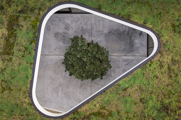 Vanuit de bovenverdieping is er een panoramisch uitzicht over het met sedum beklede dak naar het natuurgebied. Het sedum kleurt gedurende de seizoenwisselingen harmonieus mee met de bomen aan de rand van het natuurgebied. Zo hebben de bewoners ook boven fraai uitzicht. De bewoners wilden graag een besloten tuin. Deze is toegankelijk vanuit de study en via de poort bij de entree. De tuin is ontworpen met een terras, jacuzzi en een overdekte buitenkeuken. In de overkapping is ook een ronding gemaakt en zo wordt de rechte belijning van de moderne villa op meerdere punten afgewisseld met een ronde vormgeving, zowel van buiten als aan de binnenzijde.