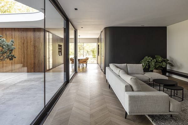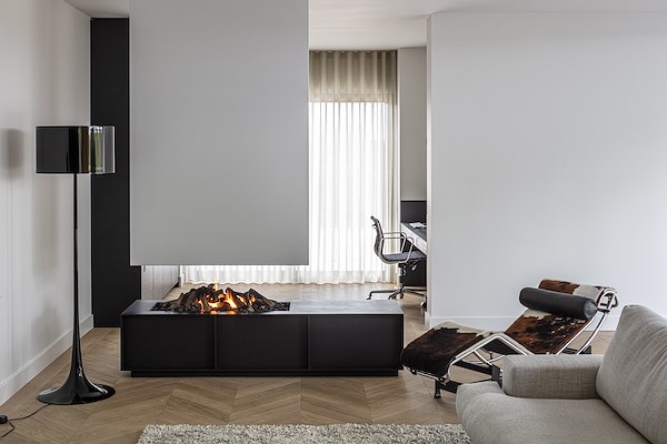 De woonkamer heeft net als de rest van de benedenverdieping, een Europese eikenhouten vloer in een Hongaarse punt, afgewerkt met olie en een matte lak. Boven, waar de slaap- en logeerkamers en badkamer van de kinderen zijn, is dezelfde houten vloer te zien, zij het in rechte planken. Het zitgedeelte en de study worden optisch van elkaar gescheiden door een sublieme haard. De study is mooi gelegen bij de glazen schuifpui grenzend aan de tuin. De haard maakt deel uit van het interieurontwerp van MR. STIR en is met vakmanschap vervaardigd, zodat er geen glazen wand omheen nodig is. Het stalen haardmeubel met ribben is ter hoogte van de vloer iets smaller en zorgt zo voor een ranke uitstraling. Deze ranke esthetiek geldt ook voor de haardombouw ter hoogte van het plafond.
