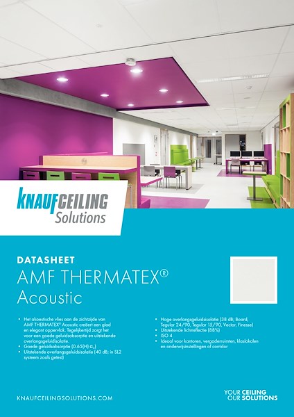 plafond, dat ook gebruikt werd in het plafondontwerp, worden gekenmerkt door het witte, homogene akoestische vlies. Het vlies bevindt zich aan de zichtzijde van de panelen en heeft een zeer hoge lichtreflectie (88%), waardoor een natuurlijke en efficiënt verlichte ruimte ontstaat.