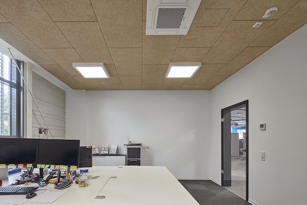 Om de serie compleet te maken, zijn in een kleiner kantoor de tijdloze HERADESIGN® akoestische panelen van houtwol in de kleur Natural gemonteerd. Alle akoestische houtwolpanelen zijn geschroefd.