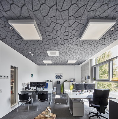 Kenmerkend voor deze oplossing zijn de akoestische panelen met regelmatige ("Groove") en onregelmatige patronen ("Bubbles" en "Turtles"). De toegepaste freestechniek creëert schaduwvoegen, waardoor de plafonds diepte en karakter krijgen. Ze hebben een opvallende uitstraling dankzij het expressieve Superfine oppervlak en de gekozen kleuren RAL 7040 (Window Gray) en 7016 (Anthracite Gray).