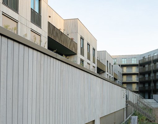 De Gebroeders Willem en Lodewjk in Eindhoven. Een woningbouwproject van twee woonblokken met een totaal van 188 woningen. De binnenzijden zijn bekleed met Platowood Populier Gevelbekleding. Het geeft de binnenwereld van het wooncomplex een duidelijk signature.