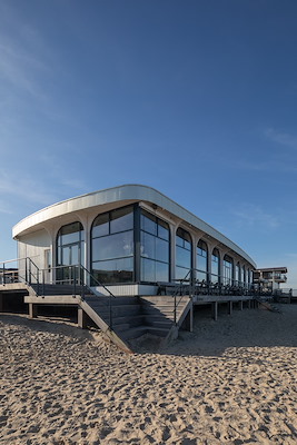 Wat direct opvalt is het glooiende dak in een lichte zandkleur. Het sluit hierdoor naadloos aan bij de omliggende duinen. De lichte bolling in het dak kan eveneens gezien worden als een kleine knipoog naar de naastgelegen watertoren. Om het geheel compleet te maken is de gevel voorzien met bogen die refereren naar de veranda van het naastgelegen badpaviljoen.