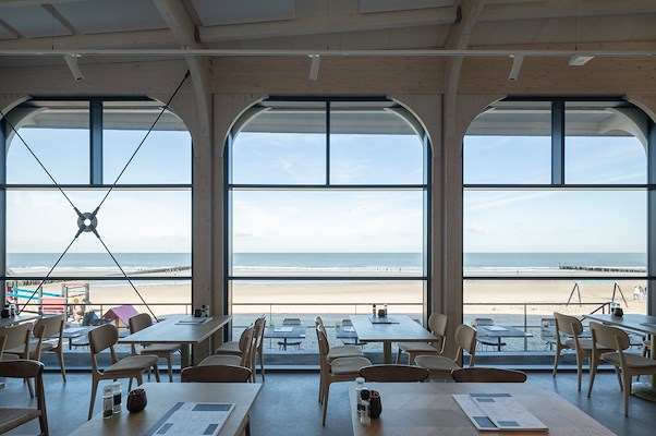 In het ontwerp is ervoor gekozen om met een brug de strandgang te laten aansluiten op de entree van de eerste verdieping. Hierdoor kunnen bezoekers het pand doorkruizen richting zee. Het gebouw bestaat uit een modulaire houten constructie voorzien van grote aluminium raampartijen die voor een prachtig uitzicht zorgen. De constructie is prefab gefabriceerd om een korte bouwtijd (tussen storm- en broedseizoen) mogelijk te maken. De veranda is bewust iets lagen gesitueerd waardoor het zicht vanuit binnen naar buiten vrij blijft.
