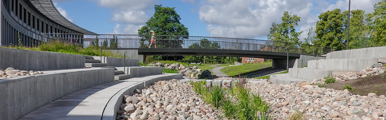 Drie moderne voetgangersbruggen verbinden de grote collegegebouwen met de omliggende natuur en overbruggen het waterbekken. Het spijlenhekwerk van deze gestandaardiseerde