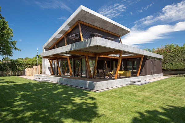 The architects Ten Hove built a holiday home in Oostkapelle in the Netherlands in a completely undogmatic way and with a pinch of humour. The rapidly changing North Sea weather was a decisive factor in the choice of materials and shape: a house was needed that would allow people to live outdoors and protect them from strong winds, sun and rain. In the colder months, it had to allow plenty of light and the warmth of the low sun into the house and also create a holiday feeling inside. This is how the architects came up with the shape: a green monopitch roof and a closed outer wall to the north. To the south, a glass façade under a long, protruding roof and above that a façade inclined towards the sun. For the construction, the architects chose an undogmatic hybrid, taking the best of each construction: